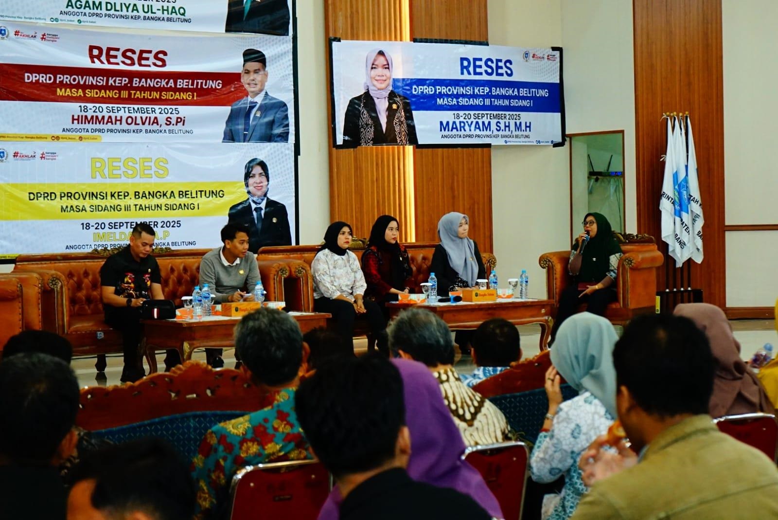 SUNGAILIAT - Anggota DPRD Provinsi Bangka Belitung Dapil Kabupaten Bangka mengelar reses bersama Para Kepala Organisasi Perangkat Daerah (OPD) serta Camat Se Kabupaten Bangka di Grha Maras Kantor Bupati Bangka Kamis (18/9/2025).  Para Anggota DPRD Bangka Belitung Dapil Kabupaten Bangka tersebut, yakni Agam Dliya Ul Haq, Himmah Olvia,  Nurita Sari, Imelda dan Maryam.